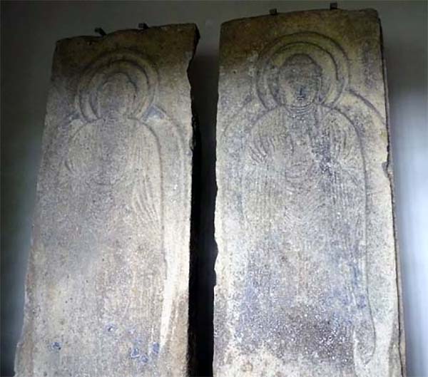 また本道に戻り進むと、集落を抜け山道になり、しばらく行くと道沿いに、「金谷の石仏」を納めた祠がある。 仏様の彫られている石材は古墳の石棺の蓋であるらしい。 |
