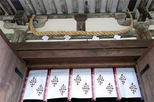 拝殿にかかる注連縄は両端が跳ね上がる独特なものだ。 |