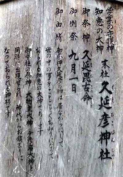 祭神の久延毘古命は、「世の中のことをことごとくお知りになっている智恵の大神」だそうだ。 |