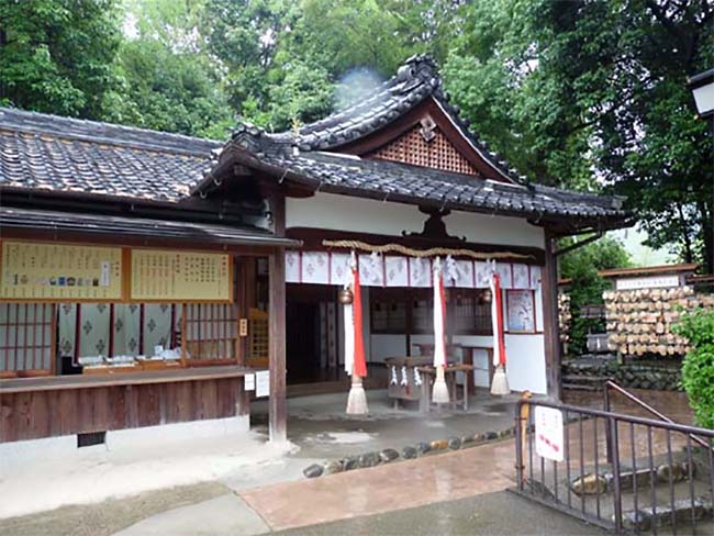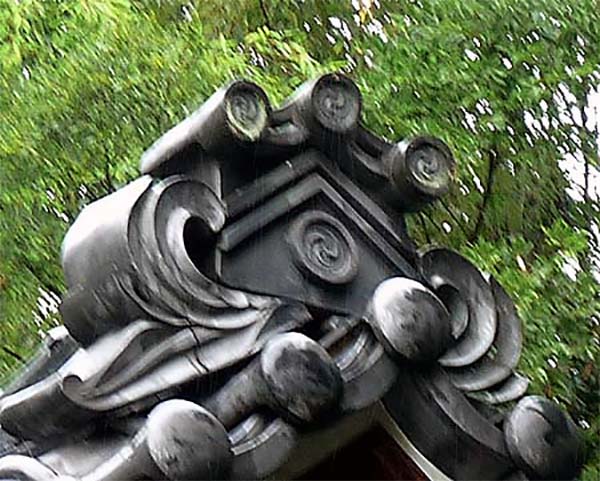 屋根に載る瓦には、水流のような「三つ巴」の神紋。 |