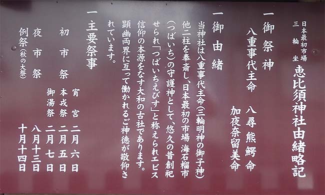 | 2010年6月13日に初めて山の辺の道を歩いたが、寄り道が多くて箸墓古墳までで帰っったので、6月20日、再訪した。 近鉄の桜井駅でJRの桜井線に乗り換え、2つ目の駅の三輪駅で降りて歩き始めた。 駅のすぐ近くに「恵比寿神社」があるのでまずはそこから。 |