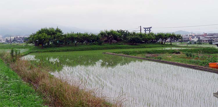 少し行くと田んぼの中に柿畑があり、田植えをしていたおじさんに聞いて、そこが「狐塚古墳」であるとわかった。 |