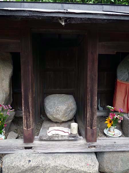 ちょうど女衆が月業のお花を供えているところで、私が格子戸から中をのぞくと、戸を開けてくれた。 坐っていたおばあちゃんが、ここの大日如来は東向きで、三輪では東向きは珍しい、と教えてくれた。 また、向かって左側にも仏像があったが、盗まれてしまったのだそうだ。 境内に、石仏があったが、真ん中のものは石が一つだけ祀られていた。 |