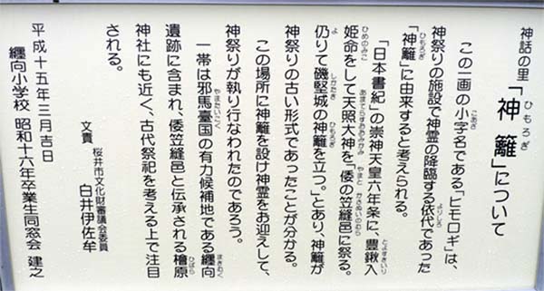 神籬遺跡のあるあたりの地名が「ひもろぎ」だそうで、古代、この地が神祀りの地であったようだ。 |