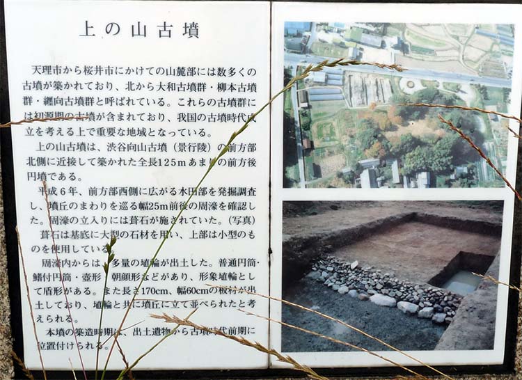 | 兵主神社から山を下ると渋谷向山古墳(景行天皇陵)がある。 山の辺の道を歩いていくと、「神籬(ひもろぎ)遺跡」の道標があったので本道からそれて行くと、それは渋谷向山古墳のベストビューの位置にあった。 |