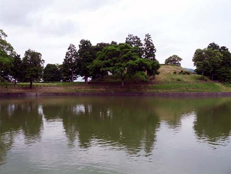 全長242mで、景行天皇陵よりは小さいが、これも巨大な古墳だ。 崇神天皇の宮跡は三輪山にあったが、なぜその陵は三輪に築かれず、ここ柳本なんだろう、と疑問に思う。 周濠は深々と水をたたえていて、こういう周濠は農業用の溜池としての用もなしていたのかなあ、とも思う。 |