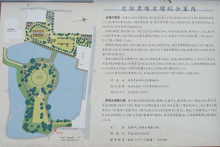 ここは、公園になっていて、「天理市黒塚古墳展示館」があり、発掘された石室の再現展示や鏡のレプリカが展示されている。 |