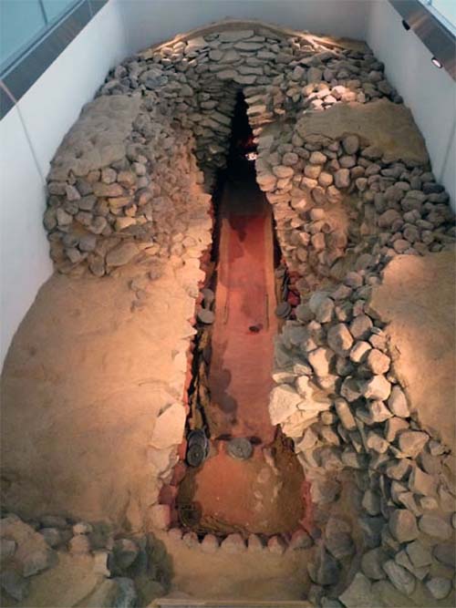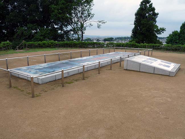 棺のなかには「画文帯神獣鏡」は1面、棺の外側に三角縁神獣鏡が33面置かれていたそうで、画文帯神獣鏡のほうが価値が高いようだ。 古墳の後円部の頂に石室の位置の説明がある。 |
