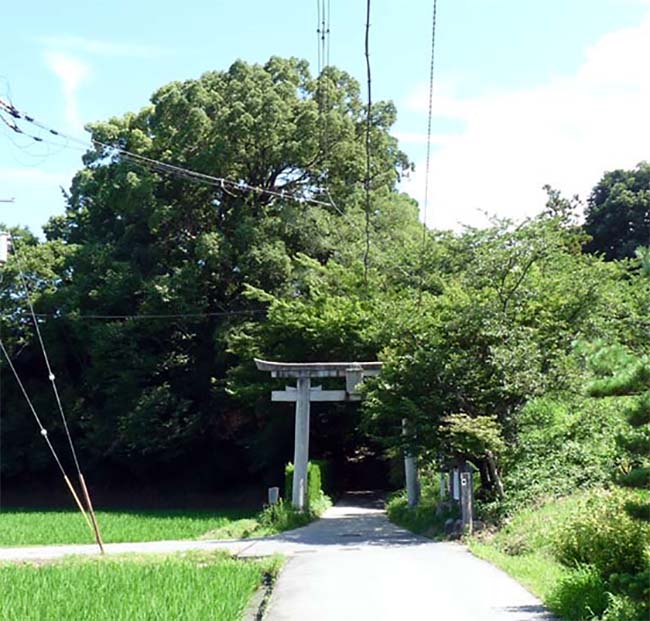 | 竹之内の集落から北へ進むと正面に夜都伎神社(やとぎじんじゃ)の鳥居が見えてくる。 |