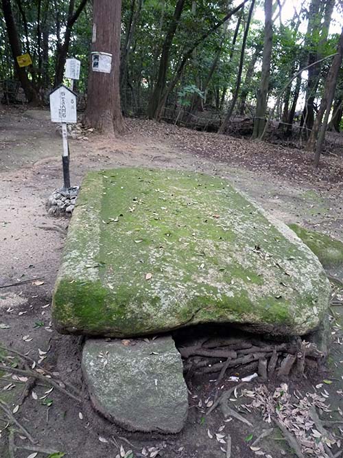 ここからさらに参道を進むと和爾下神社の鳥居があり、その脇の奥にまた柿本寺跡の立て札があり、大きな礎石もいくつか見られたので、柿本寺はかなり広い境内をもっていたようだ。 寺の礎石の近くに、古墳の石室の天井石も置かれていた。 |