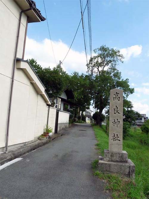 | 楢神社からJR檪本駅へ向かう途中に、高良神社(こうらじんじゃ)があり、神社の名を記した石柱は少し離れたところに立つ。 |