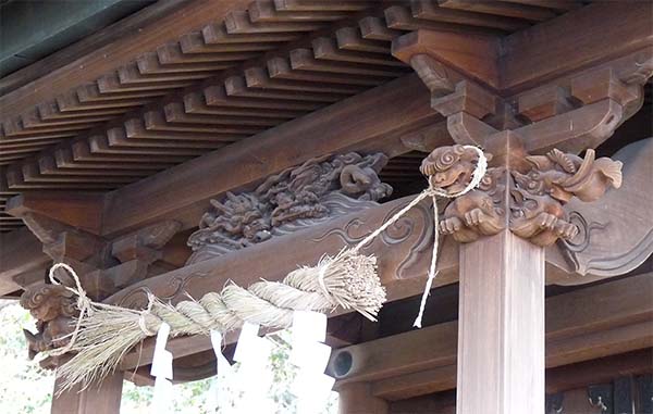 | 本殿の、龍の蟇股と獅子の木鼻。 |