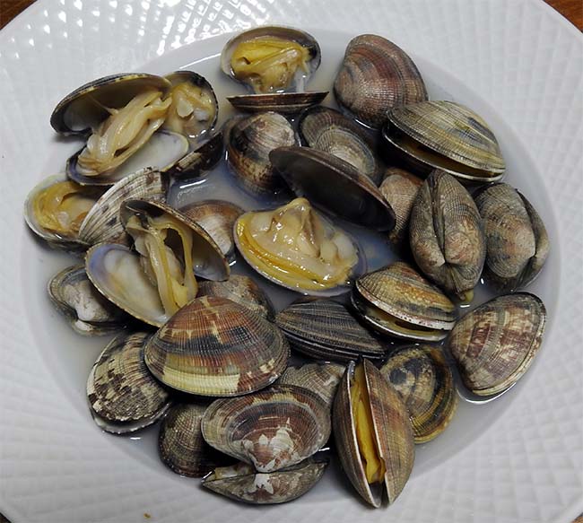 アサリは、殻幅4cmほどで1個18g 、1袋、440g。1000円。 浜名湖産かと思ったが、後日店へ行ったときには「三河産」と標示していた。 これは定番の酒蒸しにする。 いい味で旨い。 食べきれないで残ったものは、後日、身を取り出して、蒸し汁とともにご飯を炊いて、「浅利飯」にしていただいた。 |