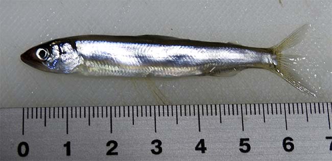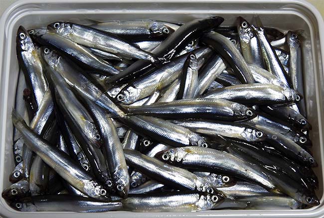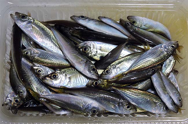 小鯵は、大きいもので全長10cm、7gほどで、1パック300g入り、800円。 |