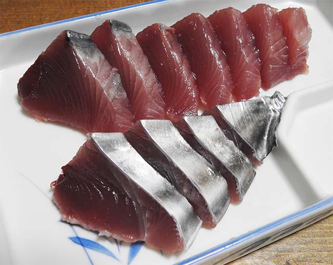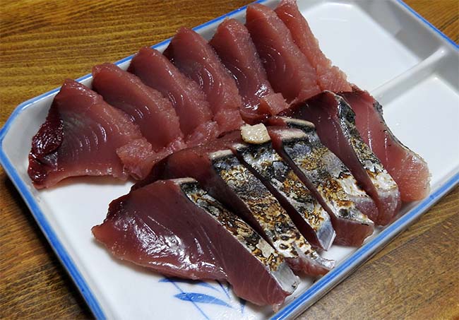 丸々と太って、買ってきてすぐにおろして刺身でいただく。 モチモチした食感の餅鰹で旨味もあり、私にとってはいい初鰹だ。 夕方も刺身で食べたが、すでに「餅」の食感はなくなり、旨味たっぷりの刺身となった。 腹側は、皮つきでいただく。 |