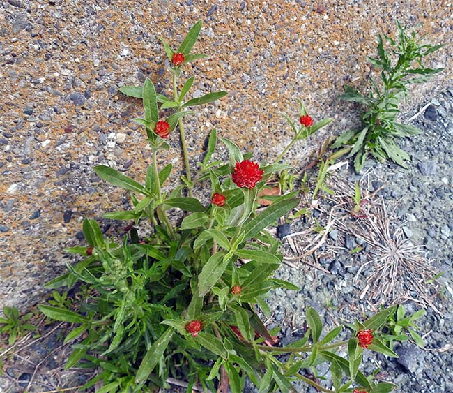 散歩では、道端に「千日紅」が咲いていた。 これは栽培種のようだが、野良花になったようだ。 花言葉は「抑えられない愛」、今や縁のないこととなってしまった。 |