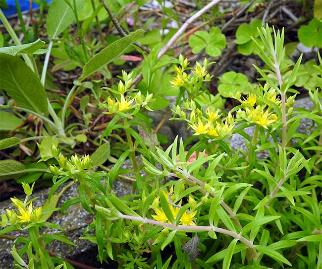 庭のコンクリートのところに這うように拡がっている「蔓万年草」の花も咲き始めた。 これも気になっていた草で、「PictureThis」で名前が判明した。 |