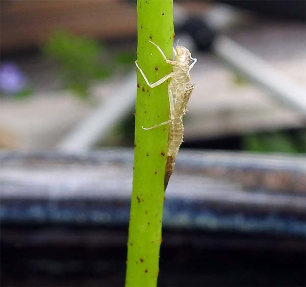 ミニ蓮の茎に、多分イトトンボのヤゴの抜け殻がくっついていた。 |