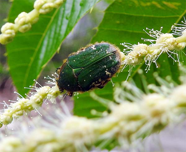 栗の花は、匂いが精液のような匂いで、ハエや色々な虫がたかっている。 まずは、「アオドウガネ」。 これは、体の側面に毛があるのが特徴のようだ。 |