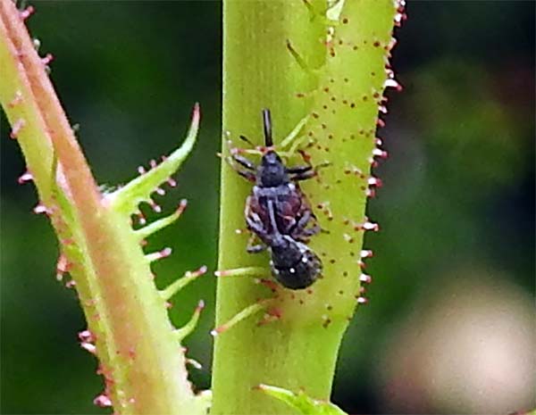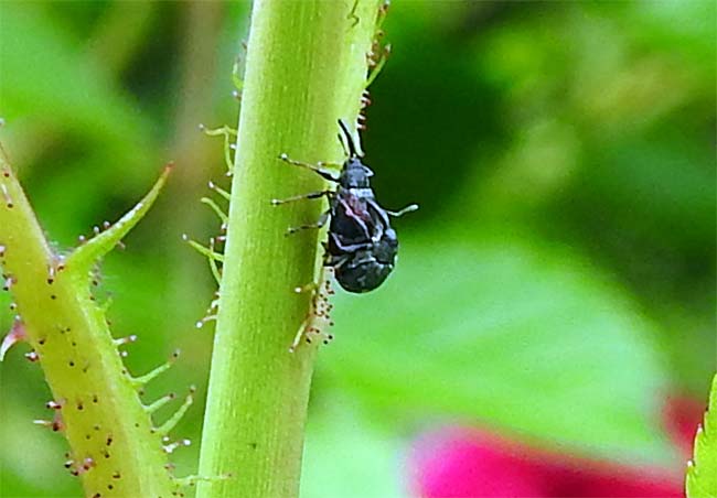 薔薇の茎に小さな虫がいて、初めはアリかと思ったが、目を凝らしてみてみるとゾウムシの類が交尾をしていた。 多分、「イチゴハナゾウシ」と思われ、イチゴやバラの花の蕾を食べるとのこと。 |