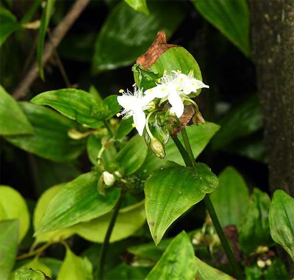 家の庭では、ツユクサが咲き始めた。 いつも初夏の花は白く、もっと暑くなると紫色の花が咲く。 |