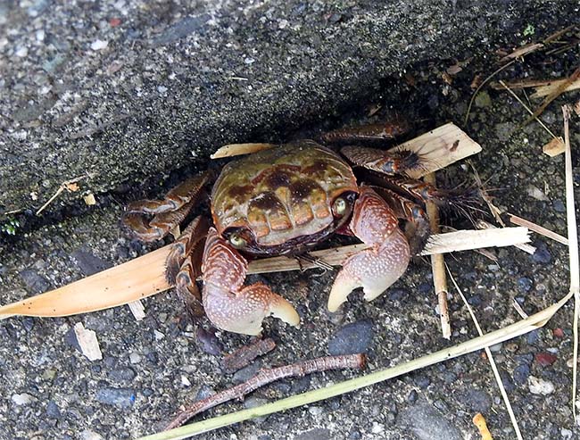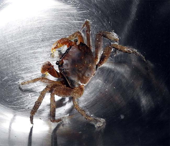 20日、家の中で「アカテガニ」の雌を発見。 毎年夏になると、どこから入り込むのかわからないが、家の中をアカテガニが歩き回る。 |