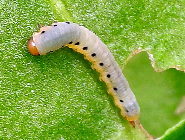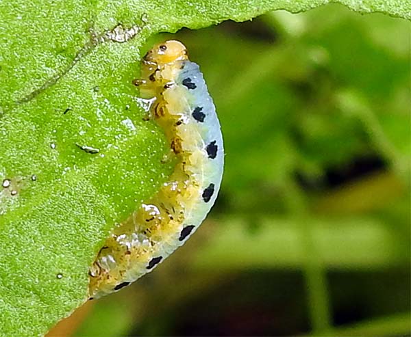 ギシギシの葉っぱに芋虫がいたので、ギシギシを食草にしているベニシジミの幼虫かと思ったが、図鑑をみると全然違っていて、蛾の幼虫らしい。 |