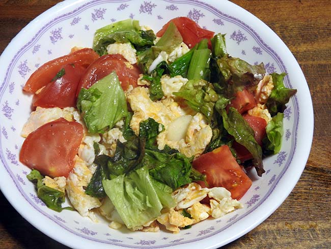 トマトは旬が近づいてきたか、今回は1個110円と安くなり、味もでてきた。 今回の「西紅柿炒蛋」はレタスがあったので、それも加えて、彩もよくなり、シャキシャキした食感が美味しさを増した。 |