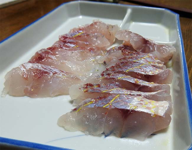 1尾は、三枚におろした片身は皮を残して、もう片方は皮を引いて刺身にしたが、皮が美しいので皮付きが正解。 脂、旨味ともしっかりのって美味い。 |