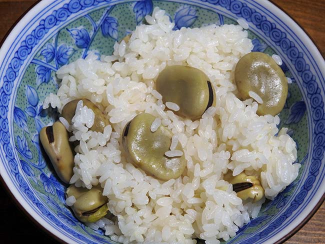 そら豆は今回は、塩を一つまみ入れて、炊き込みご飯でそら豆の豆ごはん。 そら豆の味と香りで美味しい。 |