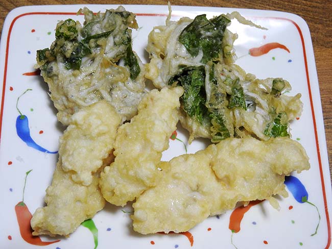 生シラスも量が多いので、青紫蘇と一緒にかき揚げにして、コチの天ぷらと一緒にいただく。 |
