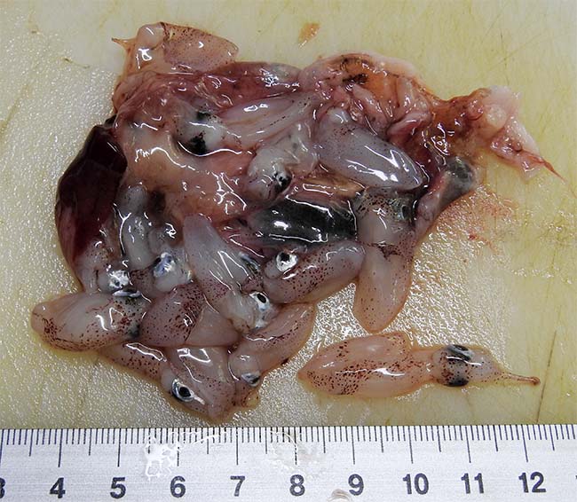 今回もお腹の中を見ていると、1尾の胃袋が大きく膨らんでいるので開いてみたら、多分生まれたばかりと思われる小さなイカの赤ちゃんがいっぱい出てきた。 |