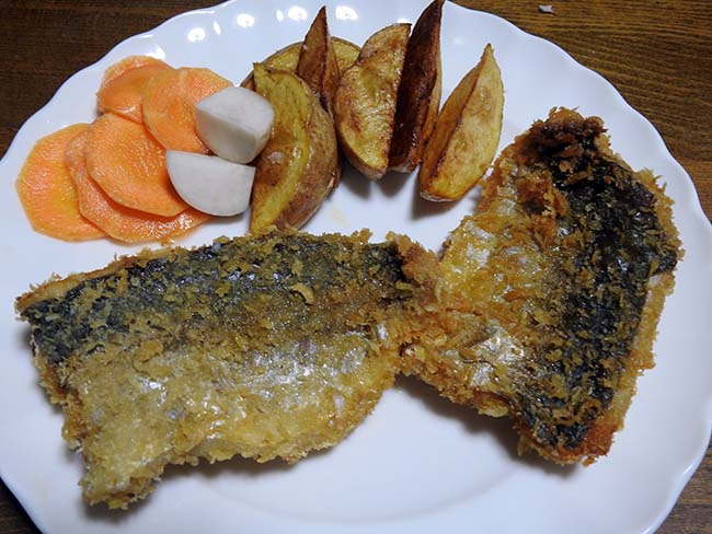 身のほうはいつものように刺身とタタキでアラは味噌汁いただいたが、今回は量もおおいので、ポテトと一緒にフライにして、鯵の「フィッシュ&フライ」にした。 |