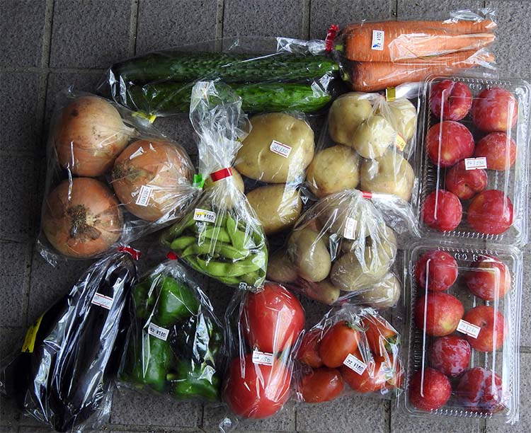 | この日のひまわりファームでは、夏野菜もいろいろ出ていた。 プラム230円*2、枝豆・茄子・ピーマン・ミニトマト・ニンジン各100円、トマト150円、胡瓜80円、玉ねぎ200円、ジャガイモ90円・100円・130円 |