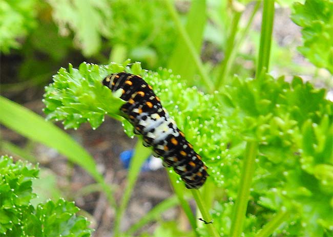 | ● 2024年7月4日 記 今年の夏至の次候は6月26~30日。 曇り気味の天気が続き、28日は大雨になった。 このところは、雨というと「大雨」になり各地で災害があり、晴れると暑くてニュースでは熱中症の話題になる。 26日、庭のパセリにキアゲハの小さな幼虫と。フェンネルに大きく育った幼虫を見つけた。 キアゲハの幼虫は、セリ科の植物を食草にするそうだ。 |