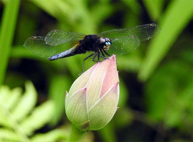 蓮の蕾が膨らんできて、ハラビロトンボがとまっている。 |