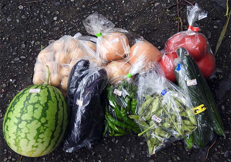 29日にはひまわりファームと舞阪の魚屋へ買い出しに行く。 ひまわりファームでは夏野菜が色々と並んであれもこれもと買ってしまった。 小玉スイカ600円。トマトと玉ねぎは各200円。茄子130円。枝豆、キュウリ、シシトウ、ジャガイモは各100円。 スイカは一か月ぐらい前から並んでいたが、やっと値段も安くなってきた。 枝豆は残念ながら味がない。 |