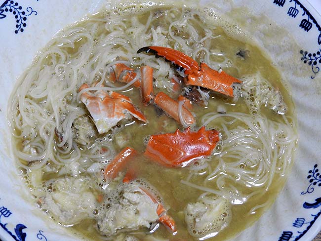 味噌汁の残りは後日、蟹素麺にした。 甲羅の味噌と胸肉は掻き出して、かたいハサミなどは割っておいて、素麵とひと煮立てして。 蟹味噌がもっと濃厚になって、これは旨い。 |