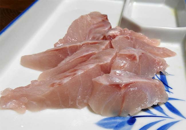 「ぼうずコンニャク」さんによれば、旬は秋から冬、春になり卵巣、精巣がふくらむと脂がやや落ちてくる、とのこと。 まずは刺身で。 身は柔らかいが、意外とスムーズに皮を引くことができた。 身の中の脂がキラキラと美しく、皮下脂肪もあり、これは美味い。 アカムツ(ノドクロ)より脂ののりがよくて美味い。 |