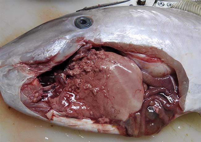肝臓は大きなのと、小さなのがあり、小さいほうはまだ小さな発達途上の卵巣や胃袋は意外と柔らかく、一緒に煮つけて、旨い。 |