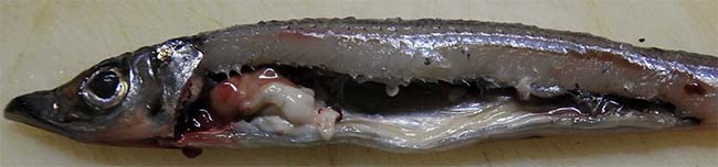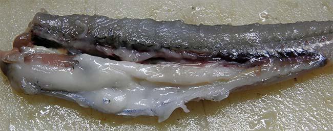 三枚におろすときに1尾目は腹腔が空っぽだったが、2尾目から白い組織で満杯になっていた。 精巣だと思ったが、味噌汁など熱が加わると溶けてなくなってしまったので、内臓脂肪かもしれない。 |