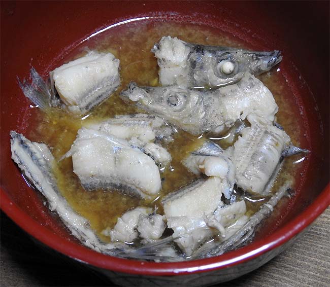 味噌汁にするのに刺身をとった3尾分のアラでは寂しいので、数尾をぶつ切りにして味噌汁にしてみた。 すごい脂で、脂っこいのが好きな私には旨みたっぷりの味噌汁になった。 |