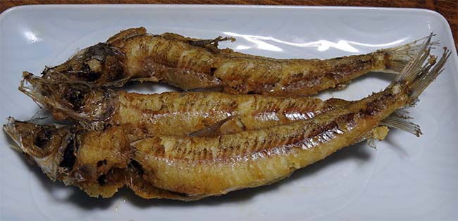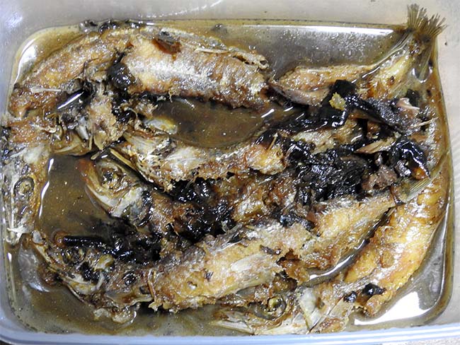 素揚げにしたものの残りは、煮付けにした煮汁で煮つけて、甘露煮のようにして、これも頭から全部食べれるの美味しい保存食になった。 |