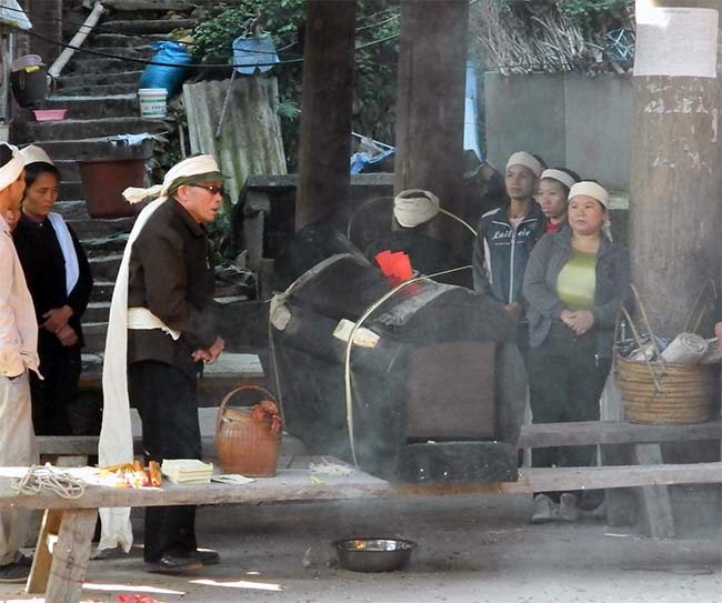 | 翌10月18日は早朝から爆竹の音が聞こえてきて、断続的に爆竹が鳴るので見に行くと、智団鼓楼でお葬式が行われていた。 侗族の葬送文化をみることができるいい機会なので終りまで見物させてもらった。 |