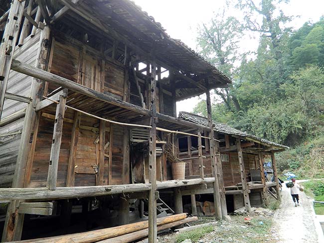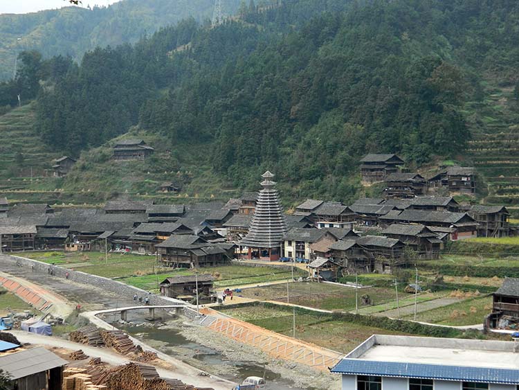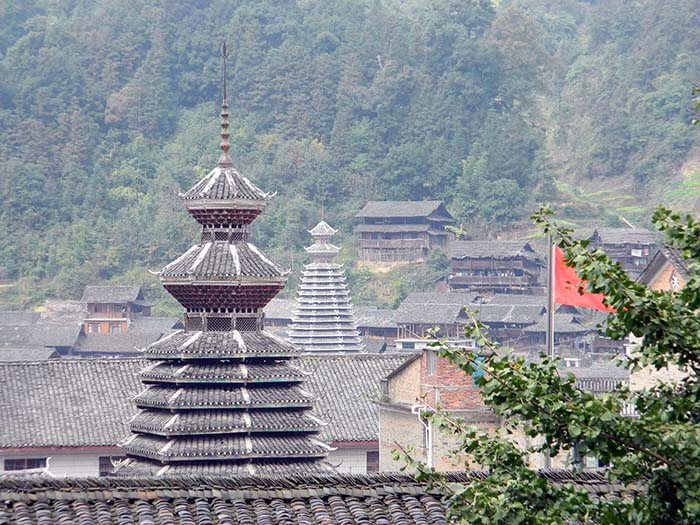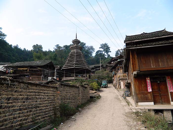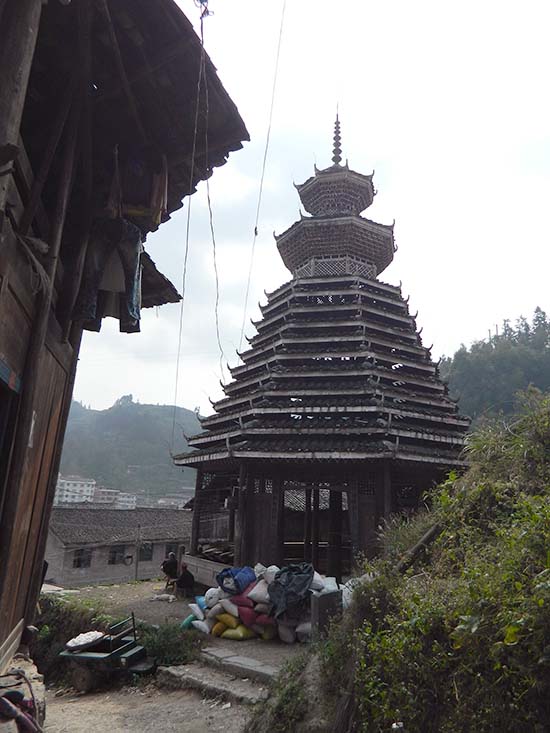 川向うの3つ目の集落へ向う。 この集落にも鼓楼がある。 |