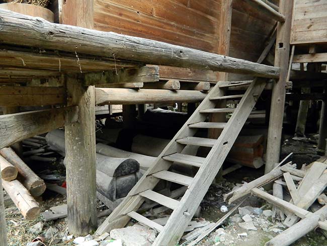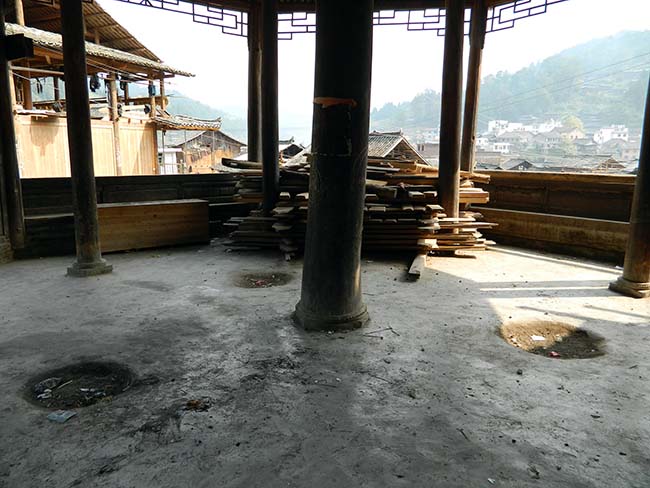 普通は、鼓楼の土間の中心に焚き火をする炉があるが、この鼓楼は中心に大黒柱が立ち、それを囲んで小さな炉が3つある。 |
