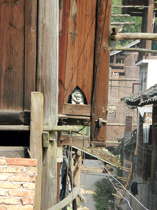 管理している青年がでてきたので、もう一度闘牛節があるかどうか聞いて見ると、翌日が「九月九(じゅうゆえじゅう)」だからあるかもしれない、と村の役所のほうに問い合わせてくれたが、今年は観光団が来ないのでやらない、との返事だった。 この侗人文化家園に日本から20人くらいの研修旅行の団体が来る予定だったのが、尖閣問題でキャンセルになってしまった、と残念そうであった。 この集落の家に厄除けだろうか、穴から覗く獅子があった。 |