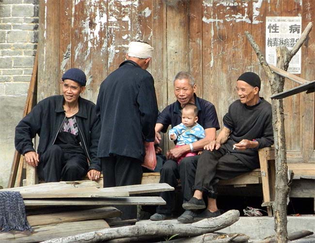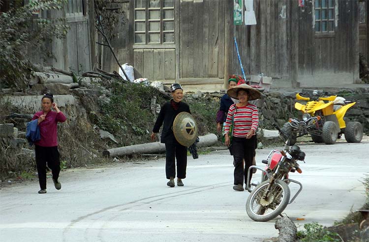 この村は3つの集落に分かれていて、それぞれに鼓楼が立っている。 まずは一番近くに見える鼓楼のほうへ歩いていくと男の二人連れがやってきたので闘牛節があるのかどうか聞いて見ると、今は村では牛は飼っていないので闘牛節はなくなった、との返事。 やっぱり無いか、、、、とがっかりしたが、村を散策することにした。 |