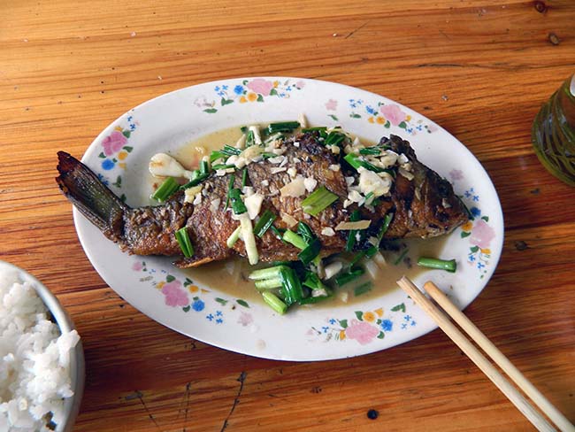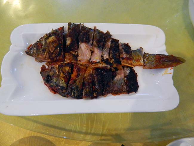 市場の向かいの食堂で昼飯にする。 水槽にいる鯉を注文、1斤40RMBで、私が食べたのは一番小さいのを選んでもらって半斤。 ビールとご飯で〆て、30RMB。 |