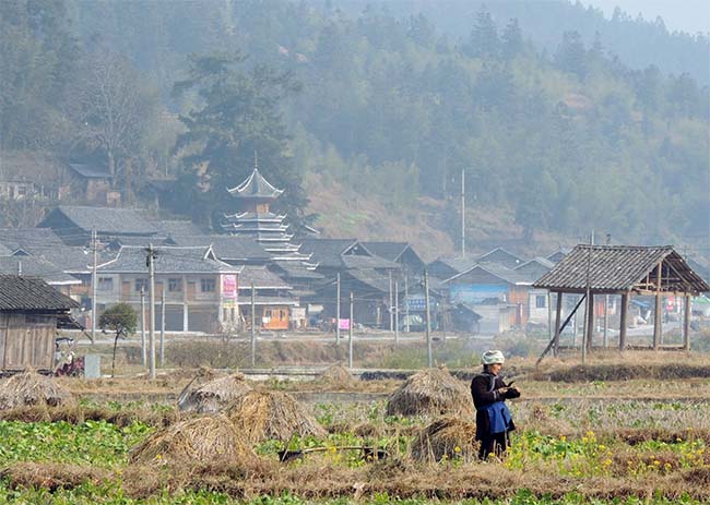 | 田んぼのあぜ道を歩いていくと鼓楼が見えてきた。 |